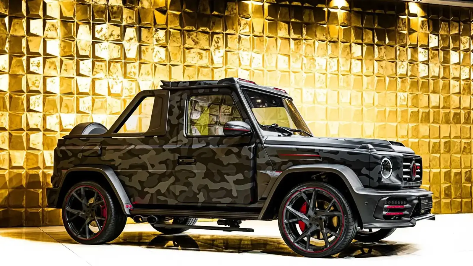 От оригинального G-Class мало что осталось: кузов укоротили, добавили грузовой отсек, полностью переработали бамперы, капот, арки и верхний обвес с использованием карбона. Пикап получил серо-чёрный камуфляж с красными акцентами, 23-дюймовые диски и эффектную подсветку красного цвета для ночного времени, как у спецтехники.